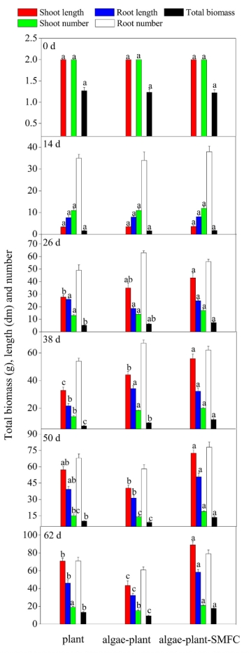 摘要指出沉積的藻類可為沉水植物提供養分,但其深層厭氧分解會抑制植物生長。沉積物微生物燃料電池(SMFC)可能促進藻源養分的利用并減輕其對黑藻(Hydrilla verticillata)的生物毒性。通過62天的微宇宙實驗(設置開路SMFC對照、植物、藻類、藻類+植物、藻類+SMFC、藻類+植物+SMFC六組),研究發現:1)黑藻的存在提升了SMFC產電性能(圖1a);2)產電過程通過改變藻類降解途徑(從乙酸裂解產甲烷轉向電化學還原)延緩藻分解(表1 CH?數據);3)在藻類緩慢分解期(14-38天),SMFC促進藻源無機碳和銨鹽向植物地上部分傳輸,提升黑藻生物量52.3%(圖2);4)在快速分解期(38-62天),SMFC減輕藻源銨鹽(NH??)對根系的毒性脅迫(圖6d-f),使沉積藻類成為穩定的植物營養源。