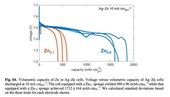 ? 數據:Ag-Zn電池中Zn2.8放電容量達1712±144 mAh cm?3(較Zn2.1提高250%)