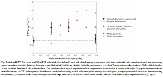 數據:游速提升2.8倍時,代謝耗氧量僅增加2倍(COT從0.6 J/m升至1.2 J/m)。
