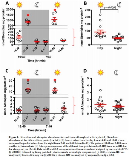 1. 海藻氨酸(Strombine) 是珊瑚主要發(fā)酵終產(chǎn)物(圖3-4),其濃度晝夜波動顯著(20-1744 nmol/mg蛋白);