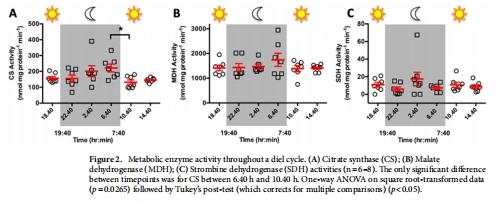 CS、MDH、SDH活性無顯著晝夜差異(p>0.05)(圖2A-C);