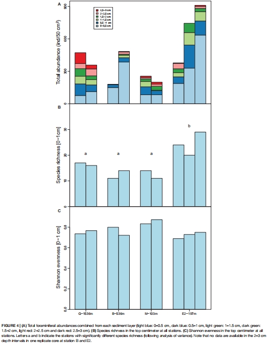 群落分析:切片沉積物(0-3 cm),CTG熒光染色鑒別活體有孔蟲,統(tǒng)計(jì)豐度與物種組成(圖4-5)。