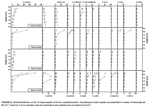 優(yōu)勢(shì)種Uvigerina peregrina在缺氧站占比32%(0-1 cm層),Globobulimina pacifica在深層占比36%(圖5)。