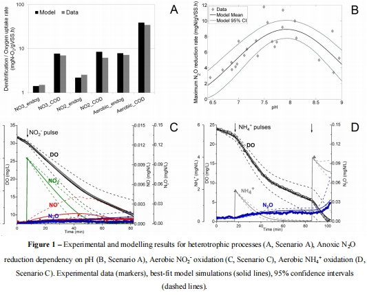 本研究開發了NDHA模型(描述三種生物N?O產生途徑),通過呼吸測量實驗校準了活性污泥混合培養物的N?O動態。關鍵突破包括: