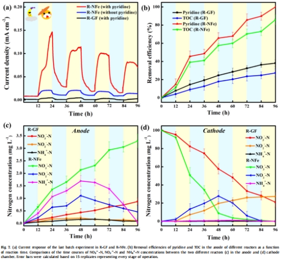 吡啶降解率85.9±5.48%(vs 對照組38.16%),TOC去除率56.32%(圖7b);