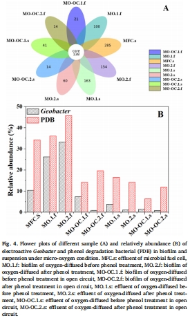 電流刺激使生物膜中電活性菌(Geobacter) 與苯酚降解菌(PDB) 豐度同步提升(Geobacter從26%→33%,PDB從36%→46%)(圖4B)。