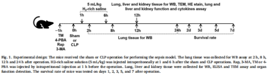 C57BL/6小鼠CLP術誘導膿毒癥(n=104),分組:對照組、CLP組、CLP+氫氣組及藥物干預組(TM/4-PBA/Rap/3-MA)。