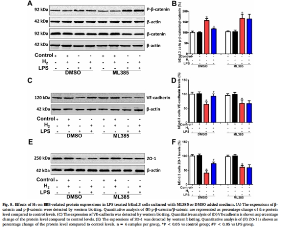 機(jī)制核心:氫氣通過Nrf2依賴途徑上調(diào)緊密連接蛋白(ZO-1)和黏附連接蛋白(VE-cadherin),抑制β-catenin磷酸化,從而修復(fù)BBB(圖7-8)。在Nrf2基因敲除(KO)小鼠中,氫氣保護(hù)作用完全消失。