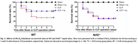 CLP組7天生存率顯著降低(WT: 40% → H?干預(yù)后↑65%;Nrf2 KO無改善)。