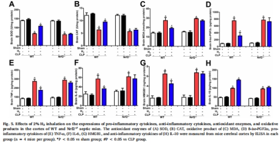 氫氣降低氧化產(chǎn)物(MDA↓40%、8-iso-PGF2α↓35%)和促炎因子(TNF-α↓45%、IL-6↓38%、HMGB1↓42%),提升抗氧化酶(SOD↑30%、CAT↑25%)和抗炎因子IL-10(↑50%),僅限WT小鼠。