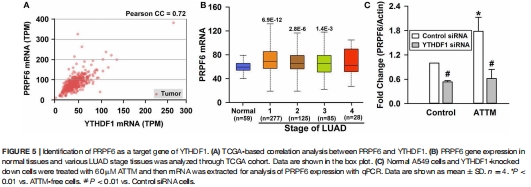 m6A 閱讀蛋白 YTHDF1 識(shí)別 PRPF6 mRNA,促進(jìn)其翻譯,驅(qū)動(dòng)腫瘤生長(zhǎng)(圖 4-5)。