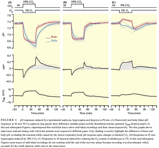 窒息導致腦pH快速下降0.47單位(呼吸性酸中毒),隨后緩慢下降0.10單位(代謝性酸中毒)(圖1A)。