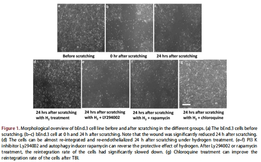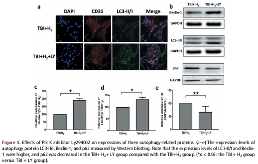 數(shù)據(jù):劃痕后24小時,TBI+H?組細(xì)胞再內(nèi)皮化程度顯著高于TBI組(圖1d),而PI3K抑制劑(LY294002)或自噬誘導(dǎo)劑(Rap)削弱該效應(yīng)(圖1e-f)。