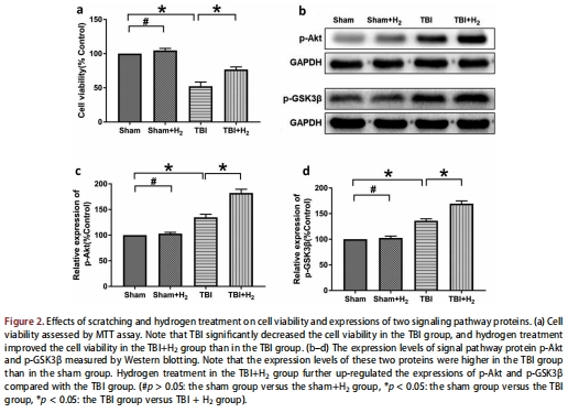 氫氣顯著提升TBI后細(xì)胞活力(MTT檢測),并激活PI3K/Akt/GSK3β信號通路(Western blot驗證)。