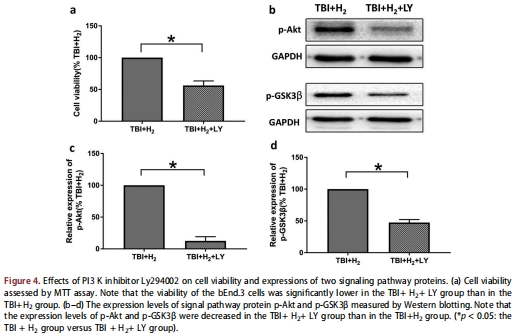 (3) 氫氣激活PI3K/Akt/GSK3β通路(圖2b-d, 4b-d)