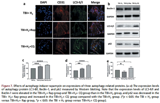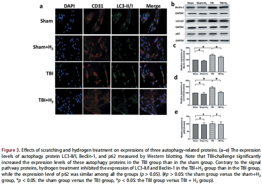 TBI誘導(dǎo)自噬(LC3-II/I、Beclin-1↑),氫氣顯著抑制其表達(dá)(圖3a-d)。