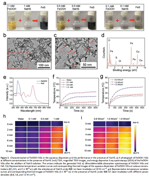 PTT激活:NaHS存在下,F(xiàn)eOOH→FeS轉(zhuǎn)化增強NIR吸收(660 nm),升溫至60℃(圖2e-i)。