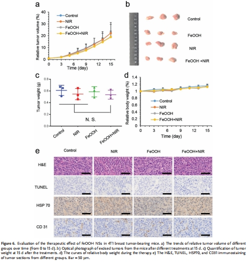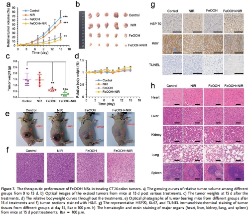 CT26模型:FeOOH + NIR組腫瘤體積抑制率86%(圖7a),重量降至0.25 g(對照組1.5 g)(圖7c)。