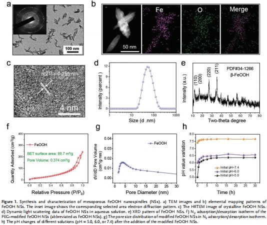 水熱法制備紡錘形FeOOH納米顆粒(尺寸≈40 nm),PEG修飾提升穩(wěn)定性(圖1a-d)。