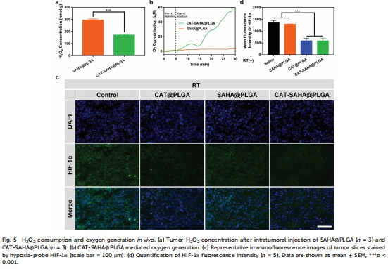 關(guān)鍵數(shù)據(jù):注射CAT-SAHA@PLGA后,氧濃度在25分鐘內(nèi)從基線升至55 μM(圖5b)。