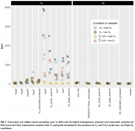 本研究通過高壓呼吸測量和離體組織實驗,首次證實盡管共生菌 "Candidatus Endoriftia persephone"基因組中存在氫化酶基因且表達活躍(圖6-7),但 氫氣(H?)并非Riftia pachyptila共生體系的主要電子供體: