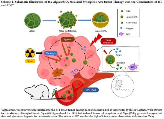功能設計:Algae@SiO?通過光合作用在激光照射下原位產氧,緩解腫瘤缺氧并增強放療敏感性;其內源葉綠素可產生ROS實現級聯光動力治療(Scheme 1)。