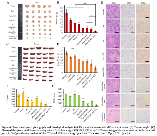 聯合治療組(Algae@SiO?+激光+RT)腫瘤體積抑制>90%(圖5C),HIF-1α表達降低(圖6G),肺轉移完全抑制(圖7)。