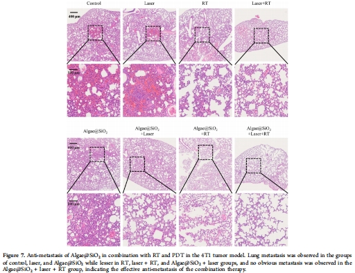 協同療效:在4T1乳腺癌模型中,Algae@SiO?聯合650 nm激光和X射線(6 Gy)顯著抑制腫瘤生長(90%以上)并減少肺轉移(圖5-7)。