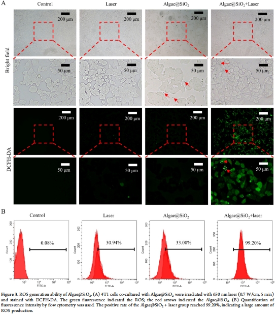 2.治療機制:Algae@SiO?通過光合產氧增敏放療,并利用葉綠素實現PDT,形成協同抗腫瘤效應。