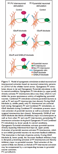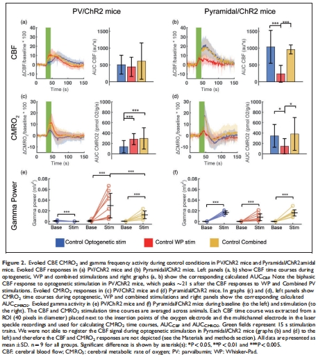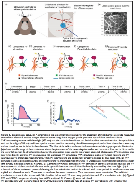 本研究通過(guò)光遺傳學(xué)技術(shù)特異性激活皮層PV中間神經(jīng)元和錐體神經(jīng)元,探究γ振蕩(gamma activity)與腦氧代謝率(CMRO?)的關(guān)系: