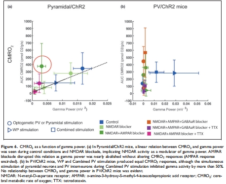 但AMPAR阻斷后γ功率↓80%而CMRO?不變(圖6a紅圈);PV激活時(shí)γ↓50%但CMRO?不變(圖6b)。