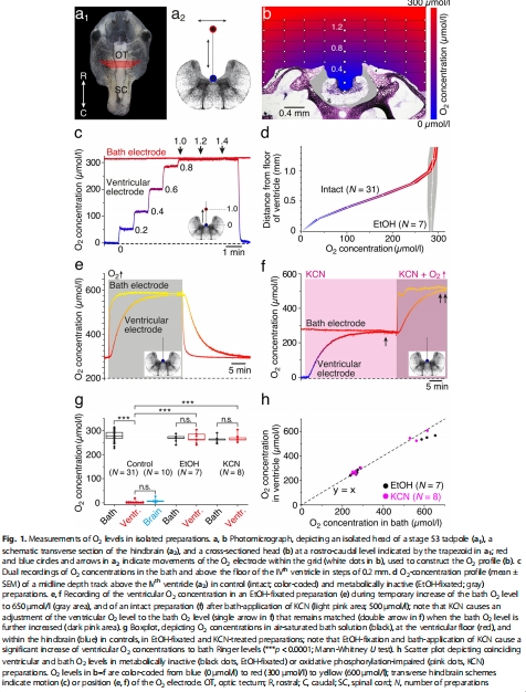 氰化鉀(KCN)阻斷線粒體呼吸后,腦室O?升至浴液水平(圖1f-g)。