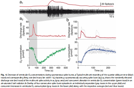 自發神經簇放電(burst)引發瞬態O?消耗增加,幅度與浴液氧濃度正相關(圖4-5)。