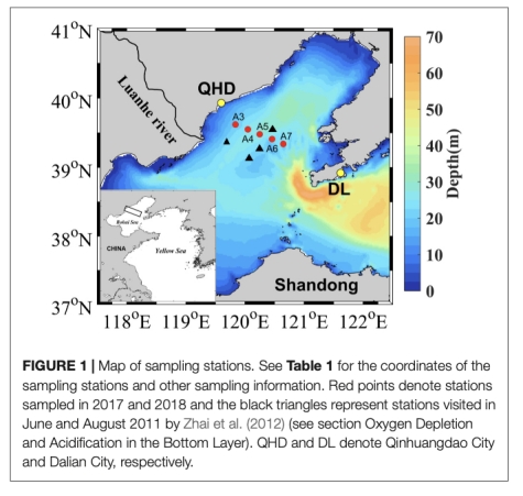 研究通過2017-2018年夏季渤海北部近岸-離岸斷面月度調查,揭示底層水體氧耗竭與酸化的動態機制: