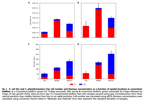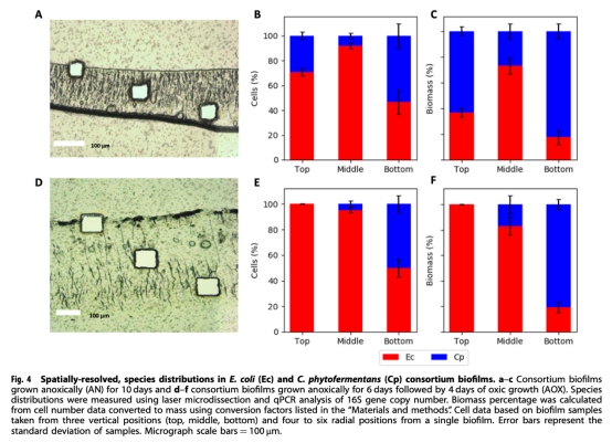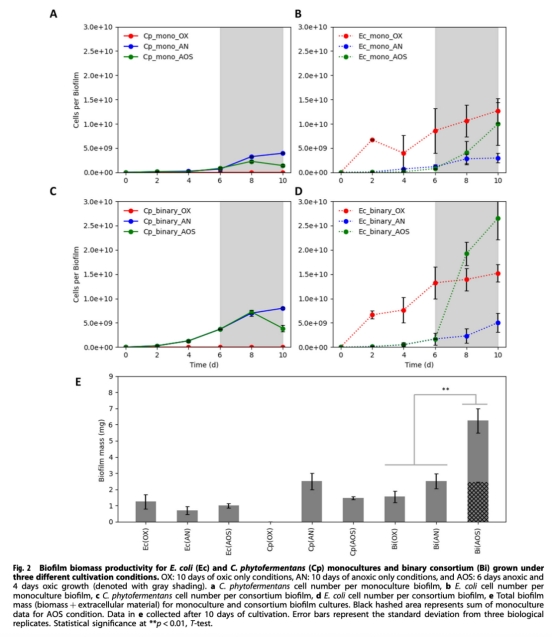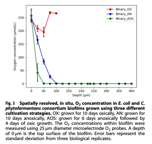 5. 生物膜O2微電極剖面(圖3):揭示E. coli消耗O2創(chuàng)造厭氧區(qū),支持C. phytofermentans存活