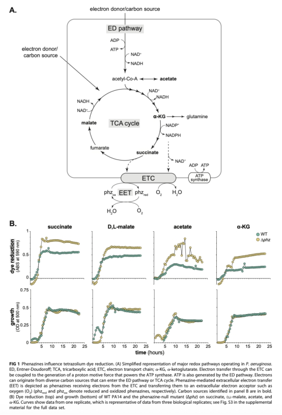 通過比較野生型PA14和吩嗪缺失突變體在不同碳源條件下的呼吸活性、末端氧化酶基因表達、吩嗪產(chǎn)量和種類,以及生物膜內(nèi)的氧化還原電位,分析吩嗪生產(chǎn)與呼吸代謝的相互影響。