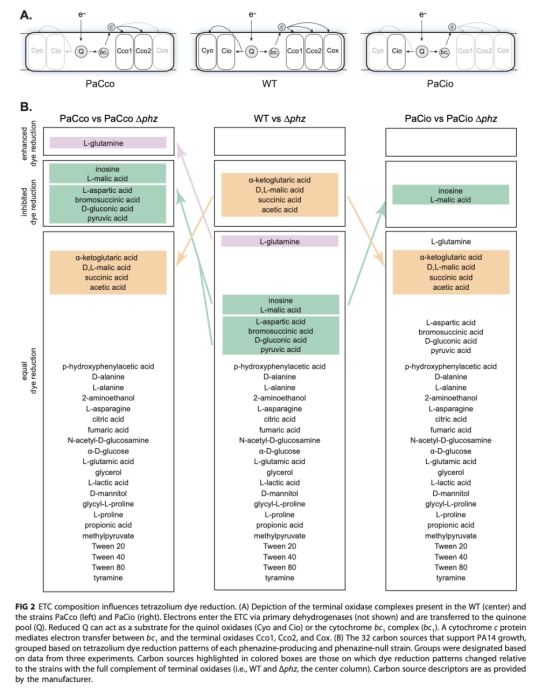4 吩嗪還原機制依賴電子傳遞鏈組成和碳源身份,Cco末端氧化酶在吩嗪還原中起主要作用,但不同碳源下其他氧化酶也可能參與。