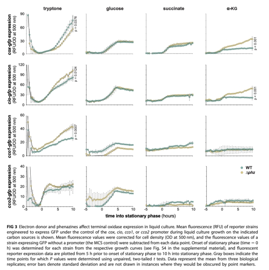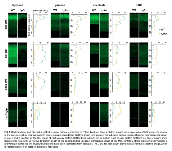 2 使用GFP報告菌株測量末端氧化酶基因表達,說明吩嗪如何影響電子傳遞鏈組成(圖3, 4)。