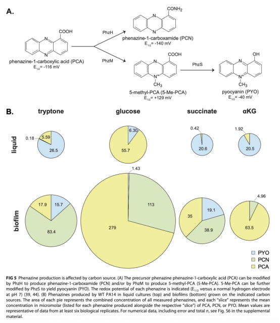 3 使用HPLC分析吩嗪產(chǎn)量和種類,揭示碳源如何影響次級代謝(圖5B)。