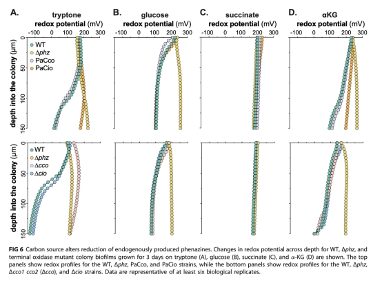4 使用微電極測量生物膜內(nèi)的氧化還原電位,展示吩嗪在生物膜中的實際利用情況(圖6)。