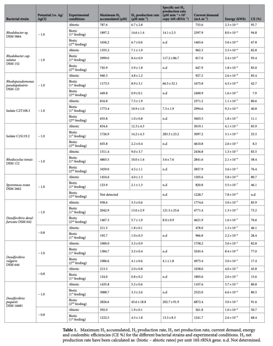 1 氫氣生產(chǎn)速率(μM min?1):通過Unisense微傳感器實(shí)時(shí)監(jiān)測,數(shù)據(jù)來自圖2、圖3和表1。意義:直接評估各菌株在生物陰極上的產(chǎn)氫效率,區(qū)分生物與非生物貢獻(xiàn),識別高效產(chǎn)氫菌株。