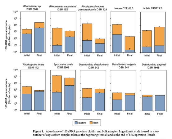 2 生物膜穩(wěn)定性(16S rRNA基因拷貝數(shù)/cm2或/mL):通過qPCR測量,數(shù)據(jù)來自圖1。意義:確認(rèn)生物膜在電極表面的附著和生長情況,評估菌株在電化學(xué)環(huán)境下的存活和穩(wěn)定性。