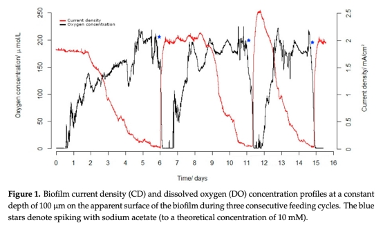 闡明在暴露于空氣的碳氈電極上發展的電生成生物膜的結構和性能,特別是氧氣在其中的作用機制。