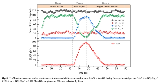 1. 向已完成全程硝化的SBR中連續(xù)投加5 mg-N/L的羥胺(NH?OH),可以在16天內(nèi)成功啟動短程硝化,使亞硝酸鹽積累率(NAR)達(dá)到95%以上。