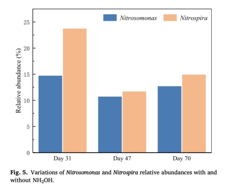 4. 微生物群落數(shù)據(jù)(來自圖5):這些數(shù)據(jù)從微生物學(xué)角度解釋了現(xiàn)象背后的原因。它證實(shí)了NH?OH對優(yōu)勢NOB(Nitrospira)的可逆抑制效應(yīng),并將宏觀的工藝性能變化與微觀的種群動態(tài)聯(lián)系起來,強(qiáng)化了結(jié)論的可靠性。
