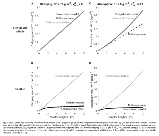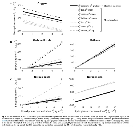 該研究探討了在污水處理等單元操作中,通過(guò)注入氣泡來(lái)吸收或剝離揮發(fā)性物質(zhì)時(shí),氣相組成和壓力沿反應(yīng)器高度的變化對(duì)總液氣傳遞速率的影響。研究推導(dǎo)了考慮摩爾分?jǐn)?shù)和壓力完整梯度或均勻值的總傳遞速率解析表達(dá)式,并通過(guò)模擬分析了揮發(fā)性物質(zhì)類型、反應(yīng)器設(shè)計(jì)和操作條件的影響。結(jié)果表明,這些影響具有高度交互性和非線性。對(duì)于可溶性物質(zhì),摩爾分?jǐn)?shù)梯度強(qiáng)烈影響總傳遞速率,而壓力梯度僅在促進(jìn)剝離的條件下重要;對(duì)于難溶性物質(zhì),壓力在促進(jìn)吸收的條件下更重要。研究還提供了通過(guò)電子表格快速選擇適當(dāng)假設(shè)的方法,并應(yīng)用于好氧生物污水處理中的常見(jiàn)氣體。