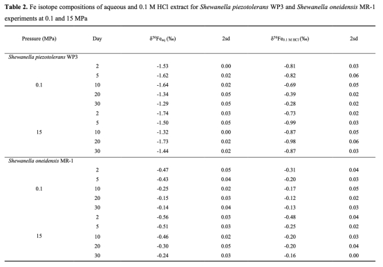 6. 估算的Δ56FeFe(II)aq-Fe(III)reac范圍隨時間變化的示意圖。該圖強調了S. piezotolerans WP3和S. oneidensis MR-1實驗估算出的分餾范圍存在顯著差異,且后者遠離-3‰的平衡值。數據來自圖3。