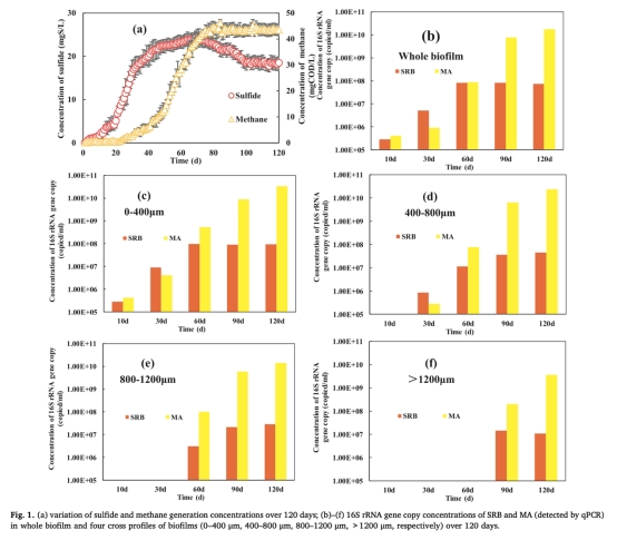 1. 在下水道生物膜形成過(guò)程中,硫化物和甲烷的生成存在時(shí)序差異:SRB及硫化物生成優(yōu)先啟動(dòng)和積累;當(dāng)硫化物積累到一定程度后,MA及甲烷生成才開(kāi)始顯著增強(qiáng)并最終穩(wěn)定在較高水平。