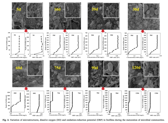 3. 生物膜結(jié)構(gòu)與微環(huán)境:使用SEM觀察了生物膜在不同成熟期(5, 20, 60, 75, 90, 120天)的微觀形貌、孔隙度和厚度(來(lái)自圖2上部電鏡圖)。使用Unisense微電極測(cè)量了生物膜剖面的DO和ORP(來(lái)自圖2下部曲線圖)。該數(shù)據(jù)揭示了生物膜內(nèi)部厭氧程度的加強(qiáng)和分層現(xiàn)象,為SRB和MA的各自優(yōu)勢(shì)活動(dòng)區(qū)域提供了物理和化學(xué)環(huán)境解釋。