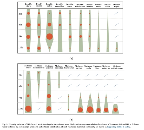 1. 硫化物和甲烷濃度:監(jiān)測(cè)了120天內(nèi)下水道水體中硫化物和甲烷濃度的動(dòng)態(tài)變化(來(lái)自圖1a)。該數(shù)據(jù)直接展示了兩種代謝產(chǎn)物在時(shí)間序列上的生成規(guī)律(硫化物先快速生成后下降,甲烷后期生成并穩(wěn)定),是揭示兩者存在相互作用的首要證據(jù)。